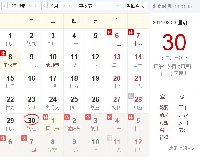 一、放假時(shí)間:自2014年10月1日(農(nóng)歷捌月捌)至2014年10月7日放假,共7天。10月8日(星期三)上班。。