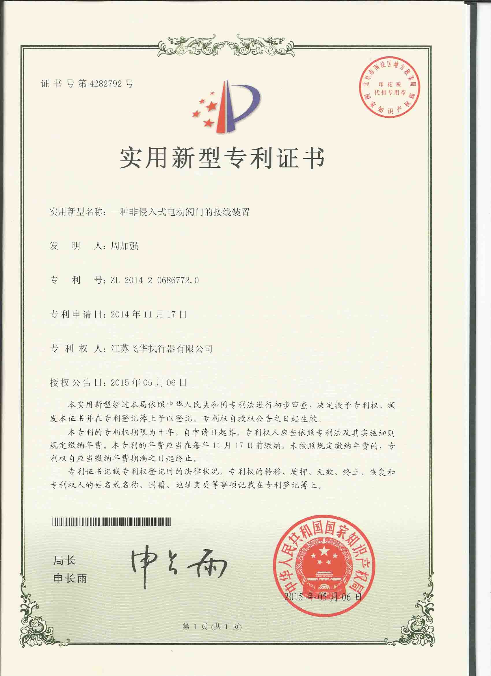江蘇飛華執(zhí)行器有限公司自主研發(fā)的“一種非侵入式電動(dòng)閥門的接線裝置”喜獲國家專利局授權(quán)頒發(fā)的專利證書。本項(xiàng)專利技術(shù)與公司主要技術(shù)直接相關(guān),通過專有技術(shù)進(jìn)行處理,解決了電動(dòng)執(zhí)行器系統(tǒng)中存在的缺陷,拓寬了設(shè)備的應(yīng)用領(lǐng)域,可以直接連接線端子部分一起更換執(zhí)行器的控制單元。