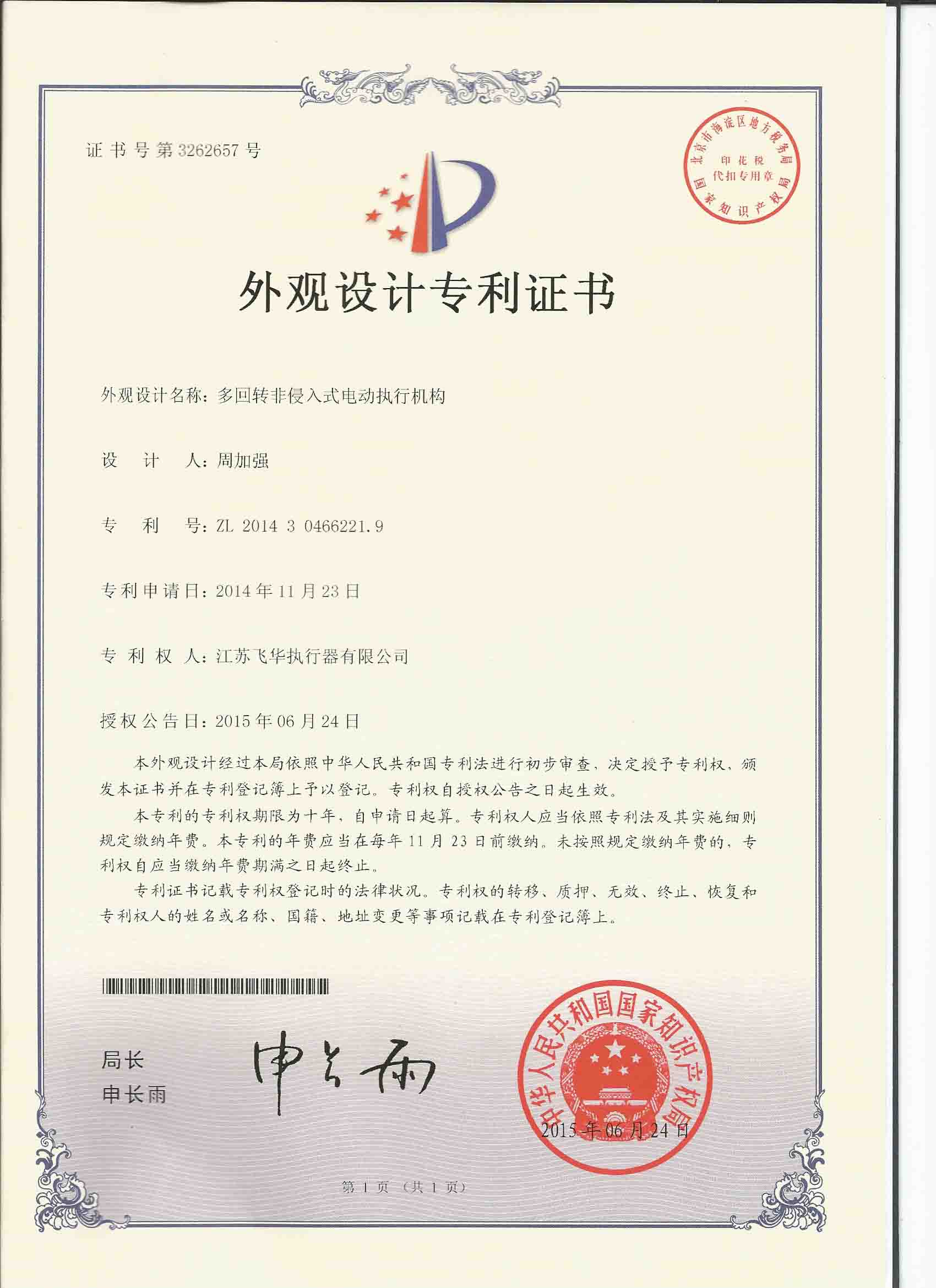 江蘇飛華執(zhí)行器有限公司自主研發(fā)的“多回轉(zhuǎn)非侵入式電動(dòng)執(zhí)行機(jī)構(gòu)”喜獲國(guó)家專利局授權(quán)頒發(fā)的專利證書。本項(xiàng)專利技術(shù)與公司主要技術(shù)直接相關(guān),通過(guò)專有技術(shù)進(jìn)行處理,解決了電動(dòng)執(zhí)行器系統(tǒng)中存在的缺陷,拓寬了設(shè)備的應(yīng)用領(lǐng)域,可以直接連接線端子部分一起更換執(zhí)行器的控制單元。